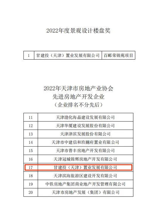 近日,由甘肅建總置業(yè)發(fā)展有限公司天津置業(yè)子公司開(kāi)發(fā)建設(shè)的百酈榮錦苑項(xiàng)目榮獲天津市房地產(chǎn)業(yè)協(xié)會(huì)2022年度景觀設(shè)計(jì)樓盤獎(jiǎng)及先進(jìn)房地產(chǎn)開(kāi)發(fā)企業(yè)。